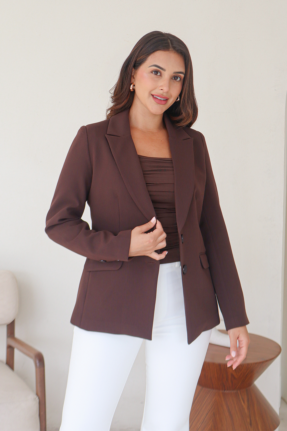 Blazers con estructura, blusas de líneas limpias que abrazan el cuerpo sin perder movimiento. Los detalles, como satín y caídas elevadas, añaden sofisticación a cada look.